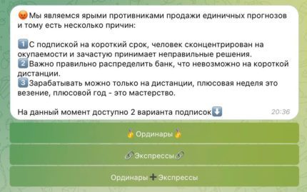Приобрести подписку можно исключительно сроком на месяц или год. Купить одиночный прогноз не получится. Каппер аргументирует это тем, что с подпиской на короткий срок, человек сконцентрирован на окупаемости и зачастую принимает неправильные решения.