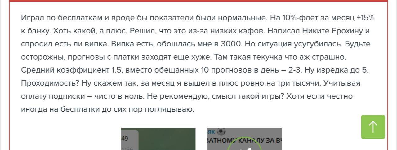 На своем бесплатном сервисе аналитик Ерохин рекламирует и продвигает платную подписку на вип-чат, где якобы выставляет больше прогнозов и с более высокой проходимостью. Цена доступа в приватный Телеграмм канал нестабильна и варьируется от 3 000 до 5 000 рублей в месяц, часто стоимость снижают в качестве акции.