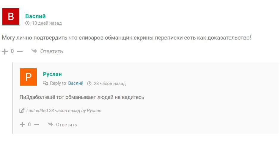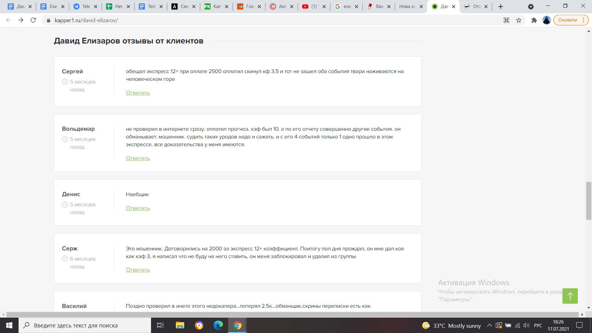 В своем Телеграмм канале Давид не публиковал отзывов, а на просторах Интернета мы столкнулись со сложностями поисков обзоров из-за смены имени. Но на тематических форумах все же нашлись обсуждения работы обозреваемого нами каппера. В отзывах Елизаров упоминается как недобросовестный аналитик, который разводит людей, продавая за большие деньги некачественные прогнозы. Как утверждают клиенты, с помощью экспрессов данного прогнозиста невозможно выйти в плюс.