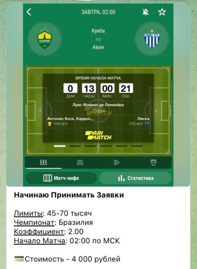 Сегодня рискну и возьму матч за 3к. После окончания отпишу, что и как. Я такой же тип, который натыкался на мошенников раз 100, будем проверять.Удачи ✊🏻