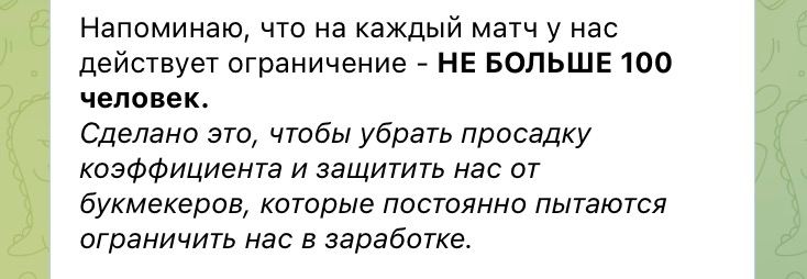 Ограничение количества мест на покупку введено каппером для защиты покупателей и самого каппера – Марк Хаткевич от просадки коэффициента, а также установления лимитов букмекерскими конторами.