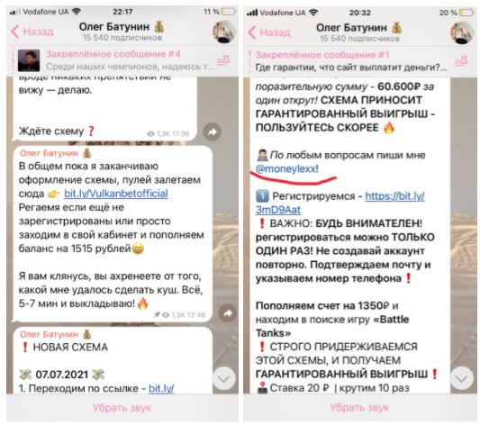 Схемы парень выставляет на бесплатном телеграм-канале, однако постоянно пишет про приватный канал, доступ в который предоставляет очень редко за неизвестную стоимость. Для игры в казино админ требует пополнить счет на 1550 рублей. Победитель должен выплатить 20% от выигрыша Олегу. Но понятное дело, что по его алгоритмам пользователи только проигрывают, с чего Батунин и имеет реальную прибыль.