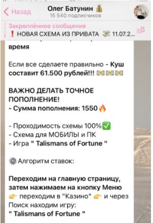 Миллионер Олег Батунин в Телеграмм специализируется на казино и составляет алгоритмы схем для выигрыша с проходимостью, как обещает, 100%. В ходе изучения контента паблика были замечены характерные для мошенников особенности: