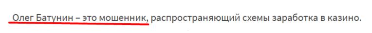 Олег тщательно чистит независимые источники от отзывов, которые могут запятнать репутацию его Телеграмм канала Миллионер Олег Батунин. Но жертв его схемы немалое количество, поэтому гневные комментарии реальных обманутых людей все же находятся. Пользователи жалуются на нерабочую схему и нечестную работу казино, которое кидает людей в случае их выигрыша.