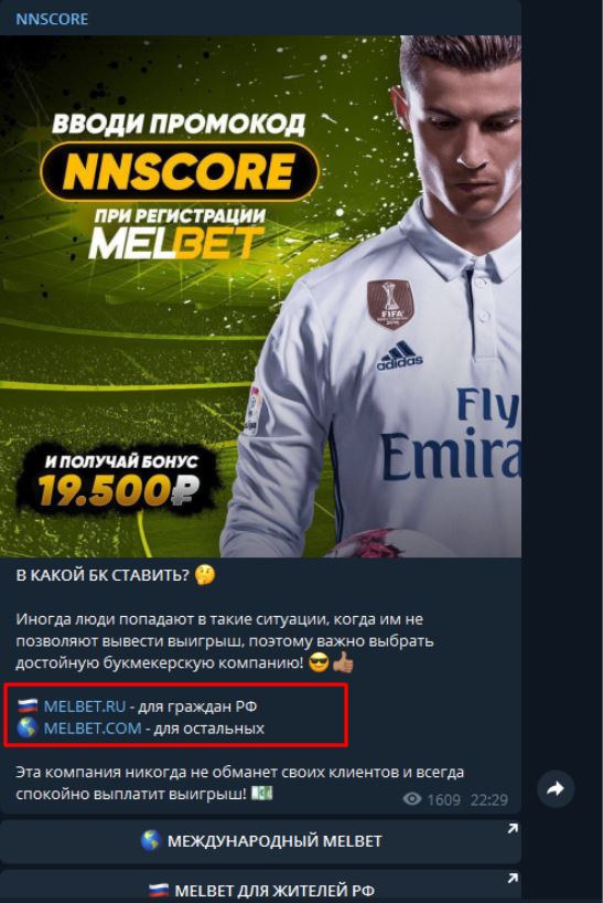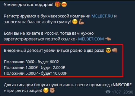 Подписчиков ловят на удочку ложными обещаниями обогатиться, если зарегистрироваться в предложенной Nn Score букмекерской компании.