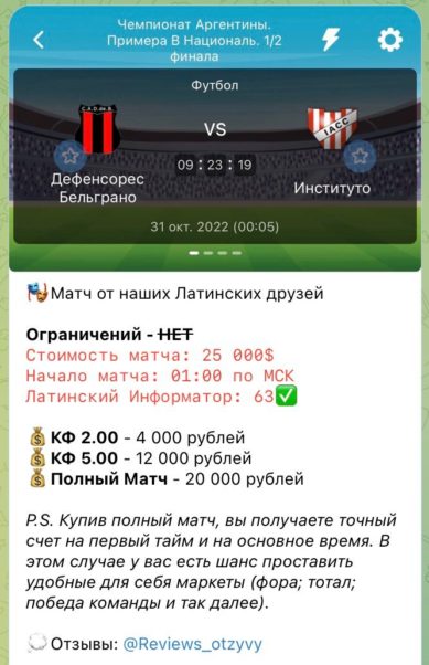 Как мы уже сказали, бесплатного в телеграмм канале информатора ничего нет. Кто-то скажет что это плохо, но плохо – это попадать на мошенников, предлагающих фейковые доги бесплатно и завлекающих ставить в партнерской БК. Никогда реальные договорные матчи никто не сольет в общий доступ бесплатно. Именно поэтому у каппера Посторонний есть ограничение на покупку сведений. Прайс у него и вовсе не фиксированный, все зависит от стоимости матча, которую заплатил он сам.