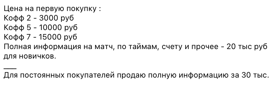 Покупая договорняк впервые, каппер Red Wings телеграмм делает скидку для завлечения клиента, это на данный момент является общепринятым форматом начала сотрудничества. Стоимость матча для новичков следующая: