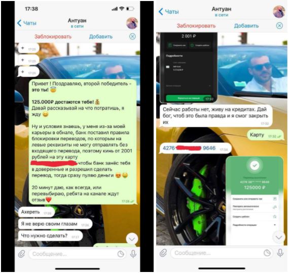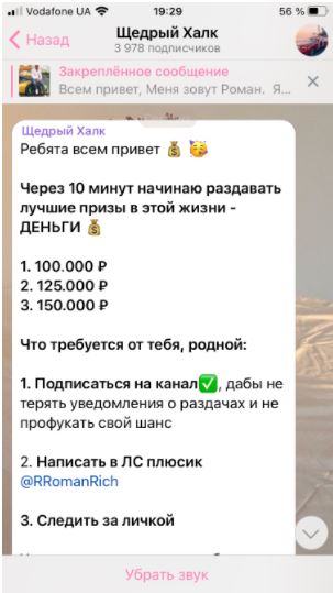 Правила розыгрыша заключаются в подписке на канал и отправке в лс Роману “+”. По факту, каждый кто отправит плюсик, получит сообщение о выигрыше. На этом этапе и начинается афера. Админ попросит оплатить 2001 рубль, чтобы снять якобы блокировку переводов от банка. После потребует пройти верификацию, также небесплатную. В конце жертва попадает в чс.