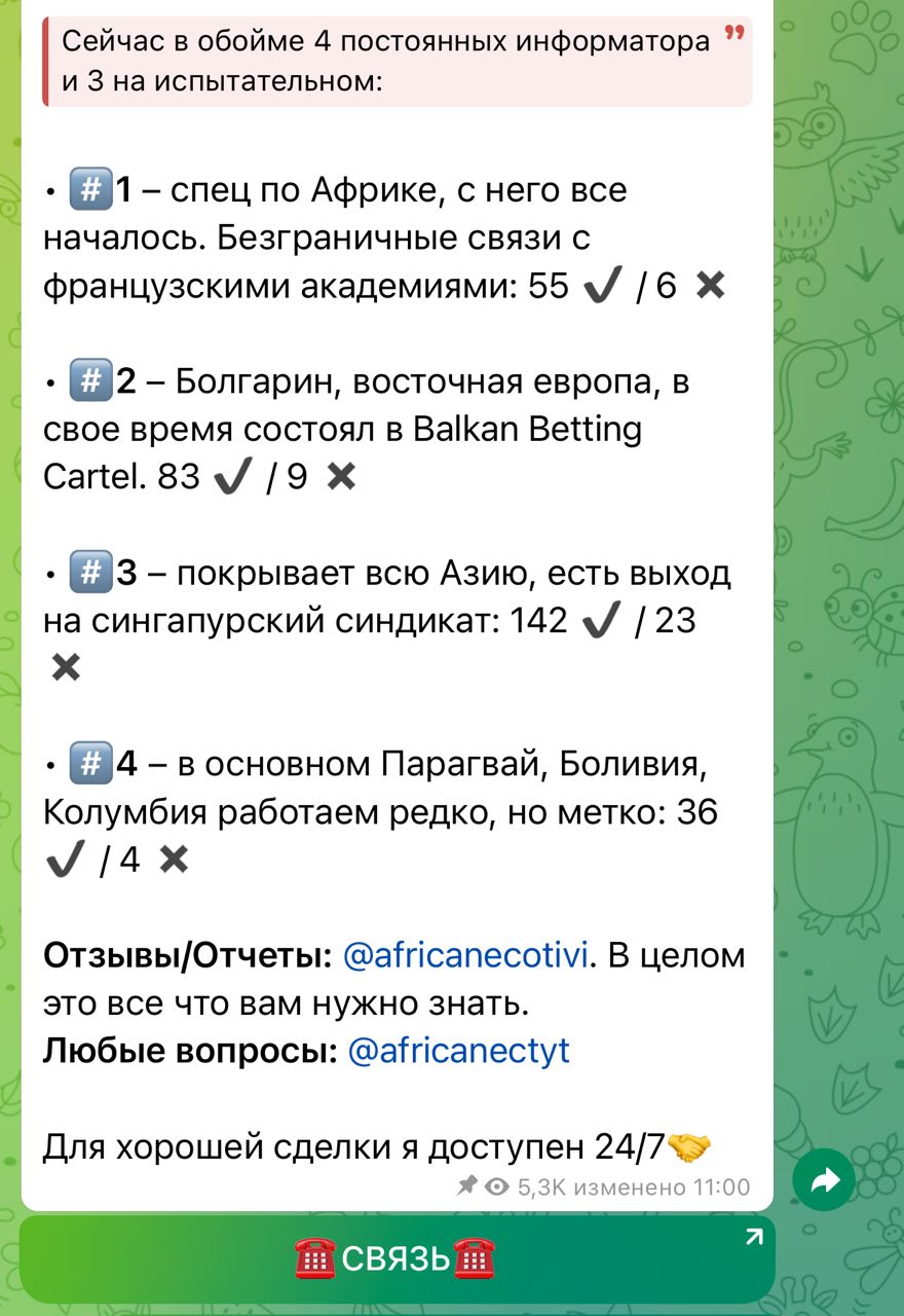 Автор проекта сотрудничает с несколькими информаторами на постоянной основе, которым безусловно выгодно так работать. Букмекерские конторы режут счета и блокируют аккаунты, за регулярные ставки на подобные матчи Все это в комплексе и вызывает потребность в перепродаже информации. А благодаря такому тандему все остаются в плюсе.