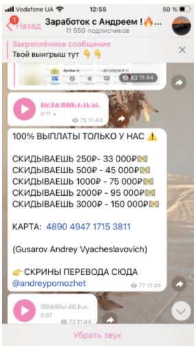 Автор проекта Андрей Гусаров Заработок в Телеграмме предлагает инвестировать определенную сумму, а выслать обратно в 100-150 раз больше. Каким образом он увеличивает количество денег, админ не рассказывает. Хотя как стало понятно по ходу нашего расследования, вложенные деньги просто идут на личный счет мошенника. То, что проект Заработок с Андреем Гусаровым в Телеграмме, отзывы подтверждают, обман, выдают следующие факты: