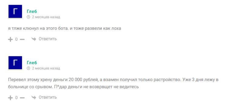 Хоть на телеграм-канале и выкладывают множество хвалебных отзывов о проекте Заработок с Андреев Гусаровым в Телеграмме, на независимых источниках ситуация противоположная. Ни один пользователь не отзывается о работе Гусарова положительно, каждый стал жертвой обмана. Обзоры предостерегают людей от сотрудничества с данным ресурсом.